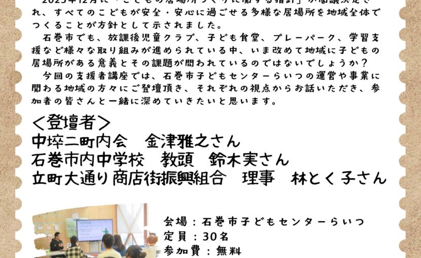今回の支援者講座では、石巻市子どもセンターらいつの運営や事業に関わる地域の方々にご登壇頂き、それぞれの視点からお話いただき、参加者の皆さんと一緒に深めていきたいと思います。