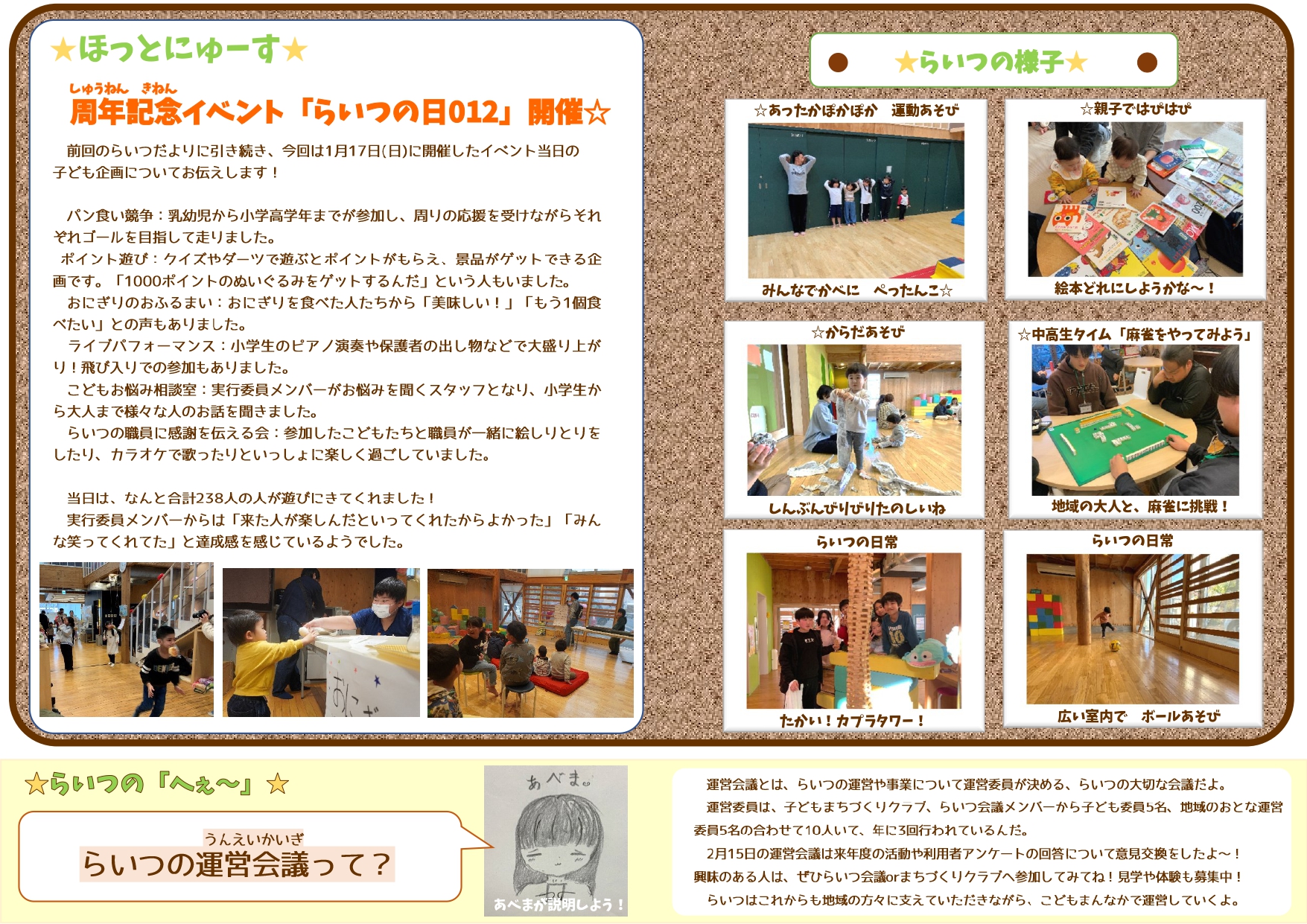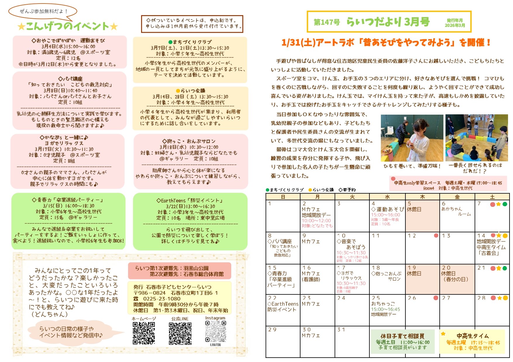 小学生以上向けイベントは3/22(日)に防災イベント、中高生向けイベントは3/14(土)に「古着会」があります♪